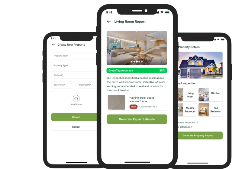 GreenTag is an Android and iOS app that lets users (buyers) scan and inspect homes or properties, using AI-powered analysis to automatically detect potential defects or damages before making an offer. Users can add and manage multiple properties within the app, capturing room-level details and generating structured inspection reports.