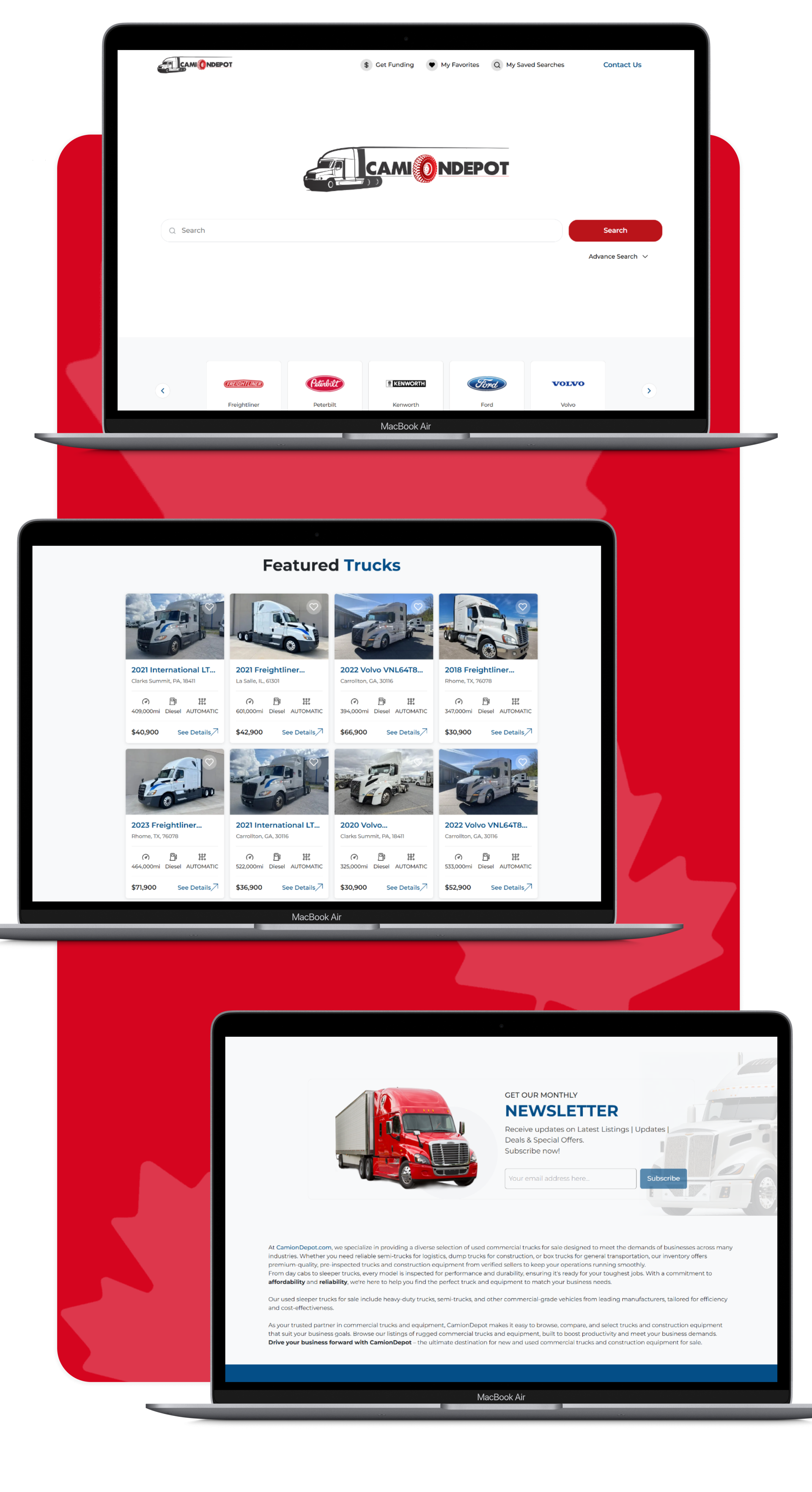 CamionDepot is a web platform built to help users easily find and finance American trucks by providing advanced filters for price range, location, make, and specifications. It streamlines the truck-buying process by allowing visitors to directly inquire about specific vehicles or explore financing options, connecting them with trusted sellers and lenders. Designed for efficiency and accessibility, CamionDepot aims to make finding the right truck simple, transparent, and reliable for buyers across the United States.