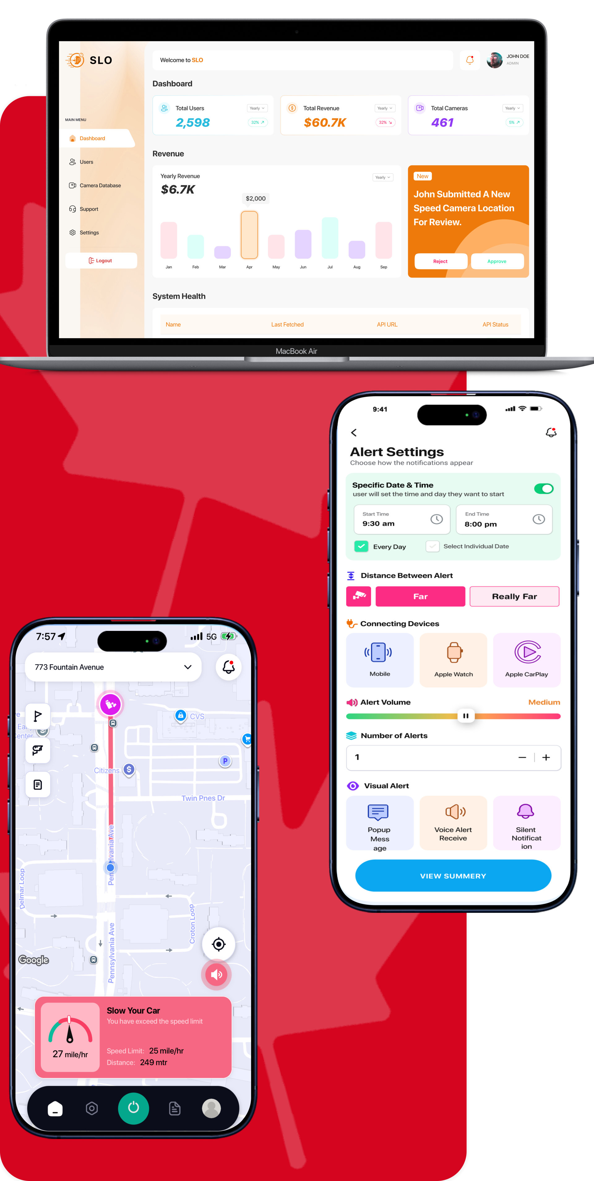 SLO is an innovative smart mobility and traffic awareness platform that helps drivers monitor their speed in real time, stay informed about nearby speed cameras, and reduce costly violations. By combining accurate car speed tracking, a comprehensive camera database, predictive route-based alerts, and user savings statistics, SLO empowers safer driving and minimizes fines. The platform also includes robust user management, subscription and payment handling, push notifications, and dedicated customer support—delivering a seamless, reliable, and user-centric SaaS experience.